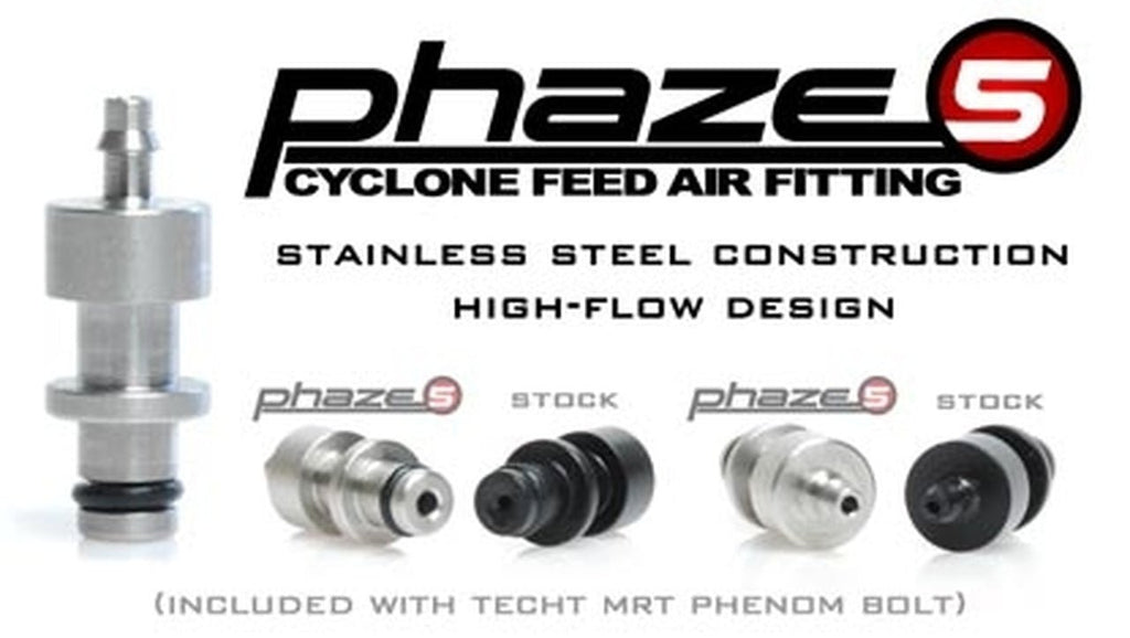 The Phaze-5 fitting is a stainless steel fitting for the Tippmann Phenom Cyclone Feed. This fitting replaces the stock fitting and allows more air to reach the Cyclone Feed with each shot. This means that your Cyclone will work at lower pressures and not require that you manually feed paint in to the gun when you are low on air.