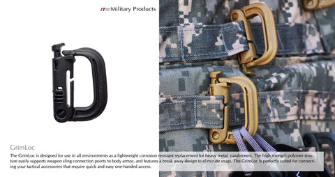 The GrimLOC™ is designed for use by operators in a tactical environment as a lightweight corrosion resistant replacement for heavy metal climbing carabineers. The high strength polymer structure easily supports weapon sling connection points to body armor, and features a break away design to eliminate snags. The GrimLOC™ is perfectly suited for connecting your tactical accessories that require quick and easy one-handed access.